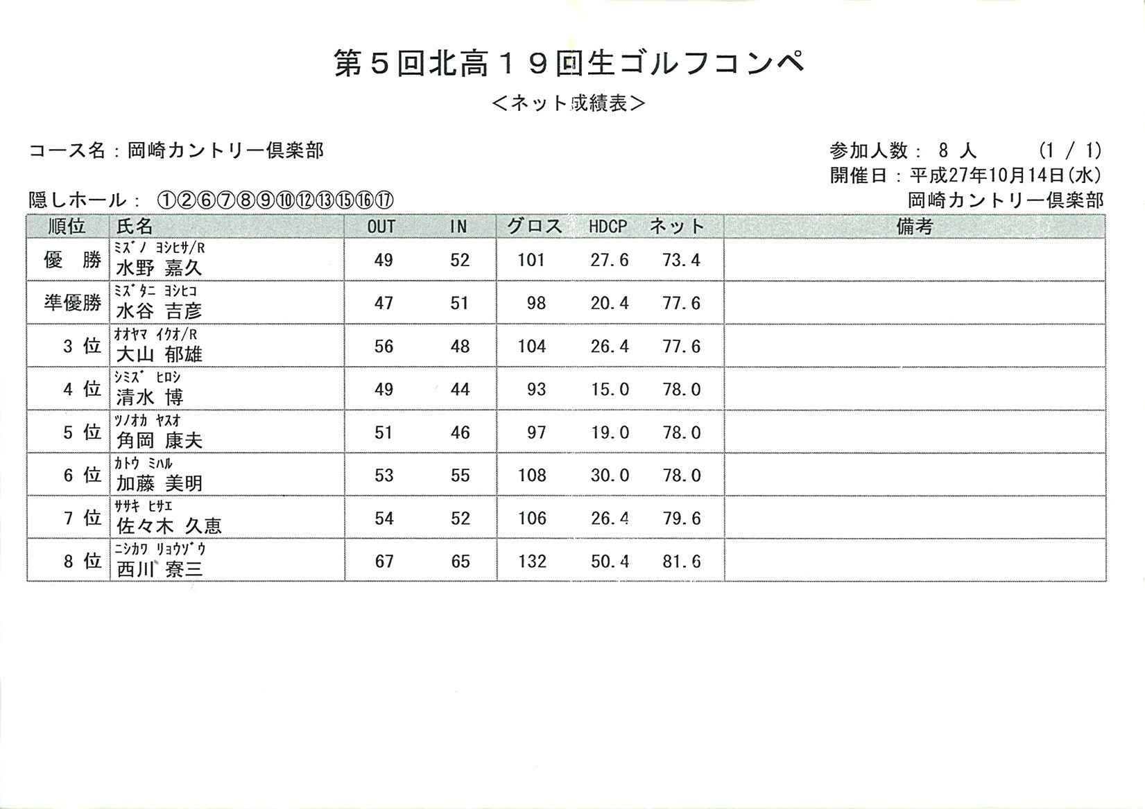 平成27年10月14日(水曜日)岡崎カントリー倶楽部にて「岡崎北高19回生ゴルフコンペ」を開催しました。