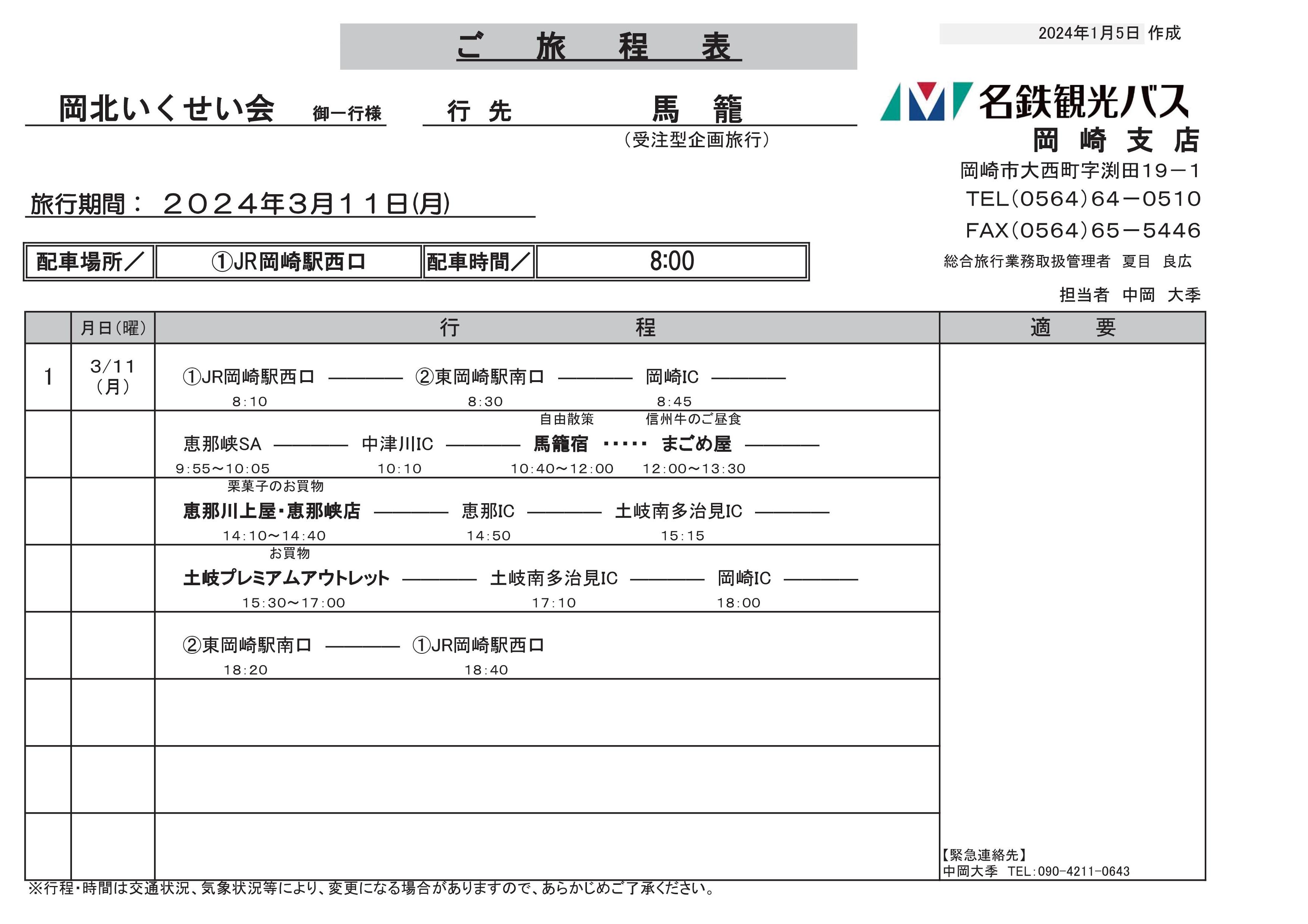 日時:令和6年3月11日(月)JR岡崎駅西口 8時10分、名鉄東岡崎駅南口 8時30分出発